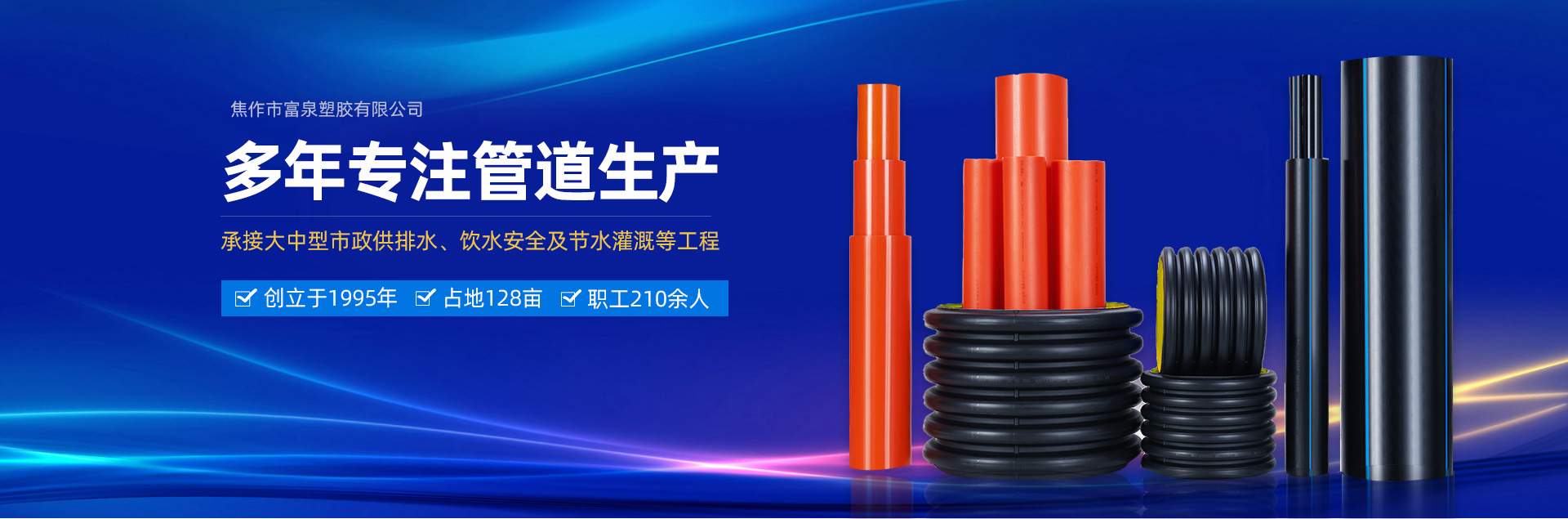 焦作市富泉塑膠有限公司,創立于1995年,是一家集研發、設計、生產、銷售為一體的大型管材企業。公司位于太極故里、黃河之濱一一河南焦作溫縣。公司占地128畝,現有職工210余人,其中具有中技術職稱的19人。生產、檢驗設備58臺(套),包括PVC實壁管生產線11套、PE實壁管生產線12套、HDPE雙壁波紋管生產線6套、PVC雙壁波紋管生產線5套,檢驗設備14臺(套)。主要產品有:Φ20mm-630mm、各種壓力規格的PVCU、PVC-M、PE給水管材,PVC-U節水灌溉管材,HDPE燃氣和礦用管材,DN200-800mm的HDPE、PVC雙壁波紋管及各種噴灌、滴灌工程材料。承接大中型市政供排水、飲水安全及節水灌溉等工程。  富泉塑膠公司重視產品的質量、安全、環保和節能,在同行業中率先完成了“新華節水產品認證”,全方面通過ISO9001:2008國際質量管理體系、IS014001:2004環境管理體系和OHSAS18001職業健康安全管理體系的一體化導入,并建立起規范的現代企業管理體系。公司以“質量”為先導,采用質量跟蹤、多環節把關的方法,組建具有行業水準的企業技術檢測中心,常年委托水利部節水灌溉設備檢測中心、河南省產品質量監督檢驗院對產品跟蹤檢測,并由中國人民保險公司承保產品質量。公司連續多年被河南省水利廳確定為“安全飲水設備、節水灌溉設備”定點生產企業,并獲得“中國名優產品”“質量、服務、信譽AAA企業”“河南省**產品”“河南省水利企業”“河南省守合同、重信用企業”等榮譽稱號?! 「蝗苣z公司堅持“用戶為上”的服務理念,長期以來,全方面關注客戶價值,不斷提升服務水平。服務隊伍常年為客戶的產品設計、施工、安裝提供合理的方案和全程細致、周到、**、快捷的技術服務。公司自成立以來,一直堅持以人為本的宗旨,塑造企業形象,并致力于新產品的開發,憑借雄厚的技術開發能力,先進的工藝制造流程,嚴格的質量管理保證體系,優良的售后服務網絡,已成為河南省大的飲水、灌溉及排水管材設備制造商。產品暢銷全國,而且還以公司雄厚的綜合實力在業界中占據著重要的地位。